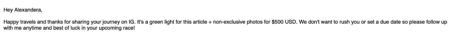 He’d offered zero guidelines for photos to accompany the piece and only offered to pay the minimum price I accept for writing— leaving the images to accompany the piece uncompensated. If there were a better budget, I would submit better pictures, for which I would pay Eszter or Corey, or any of the other pros who have snapped my photo, for commercial use of the images. But I refuse to reach out to my friends who are photographers and use pictures for pieces I am hired to write unless they are compensated. Duh.