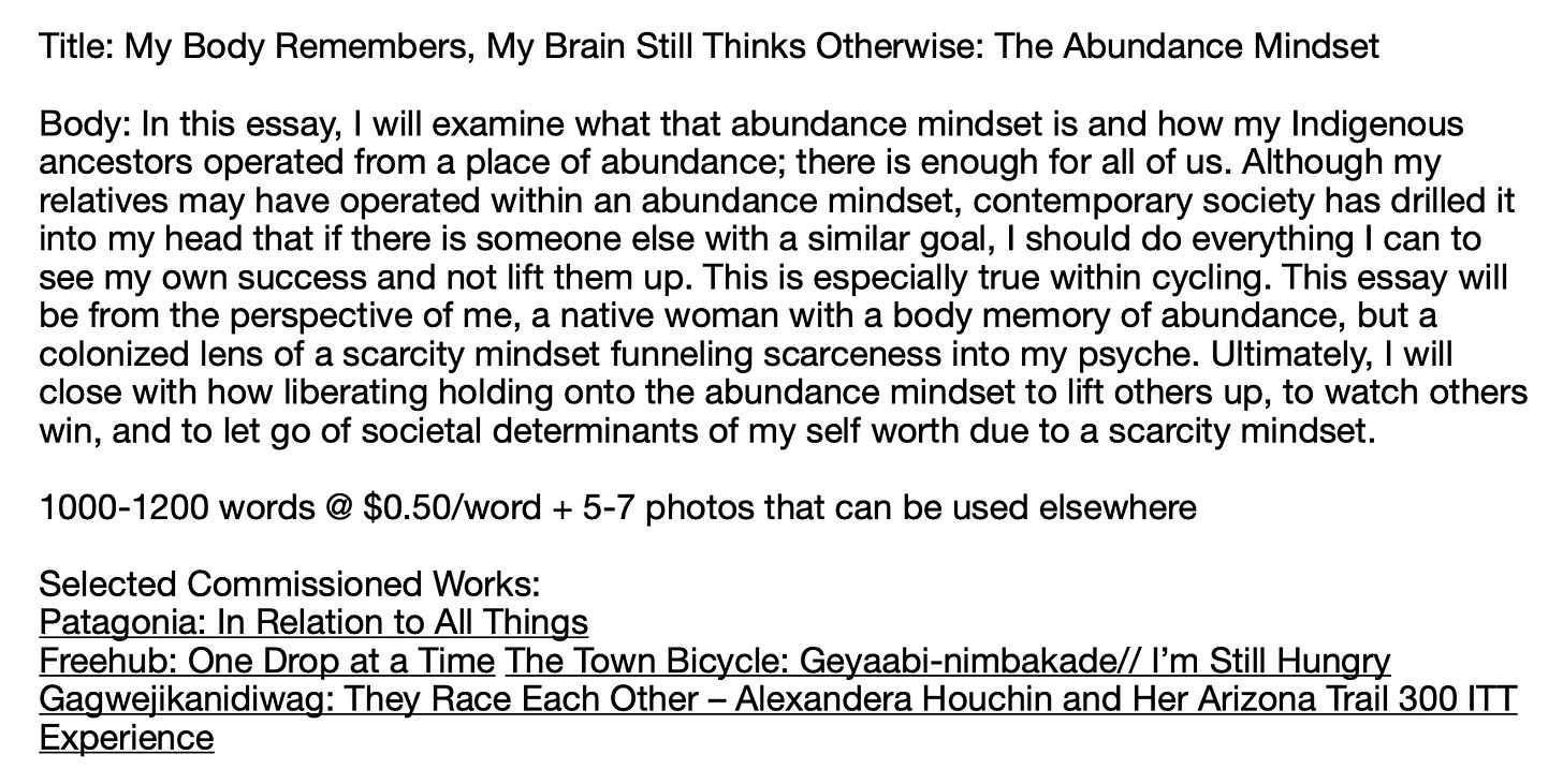 Someone from an online platform contacted me on Instagram and asked me to write an article for their platform. I missed the first message, and my Instagram inbox is full of messages that so often go directly to my “requests” inbox, where they get lost. He reached out again in April, and I sent a pitch their way shortly thereafter. They said they’d “greenlit” my article and that there was “no deadline.” I decided that a before the end of the year deadline was placed in my calendar as I had a few other gigs that paid more and thus became a priority— as he reiterated many times that there was no deadline. I’d pitched that I’d write about “mountain biking” centered around my perception of the scarcity mindset and how operating from an abundance mindset could change things.